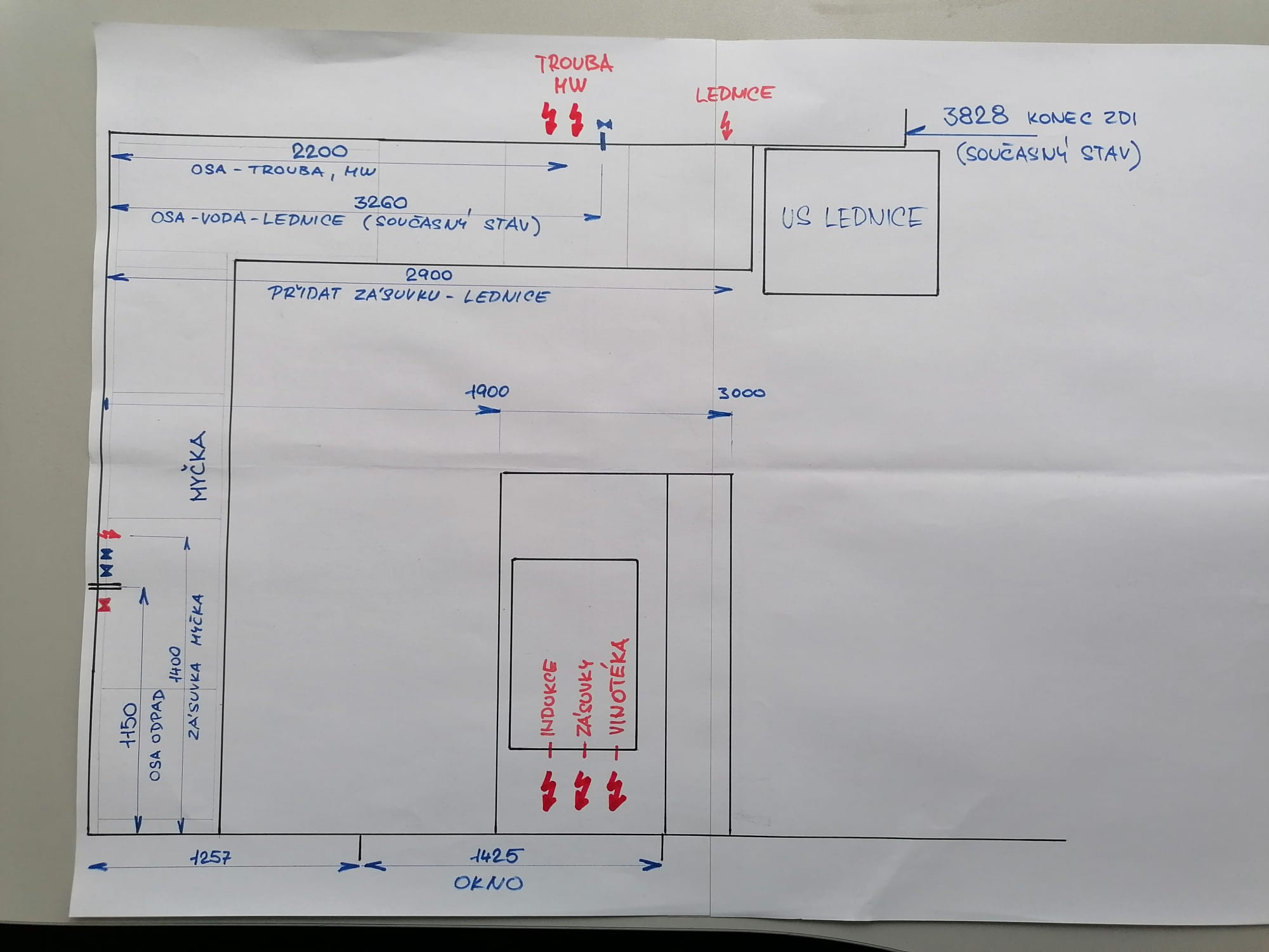 Poznámky od truhláře: Ještě k lednici, myslím že přívod vody může zůstat, to dopojuje vodař PE hadičkou, jen přidat zásuvku. Zásuvky na Trouba/MW zkontrolovat zda jsou v linii sloupu osa 2200.